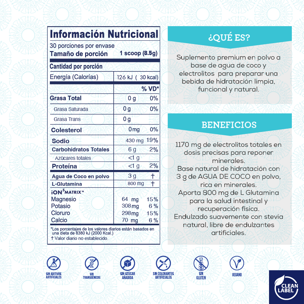 • iON⁵ Matrix™️ : sistema avanzado de 5 electrolitos: sodio, potasio, magnesio, calcio y cloruro.