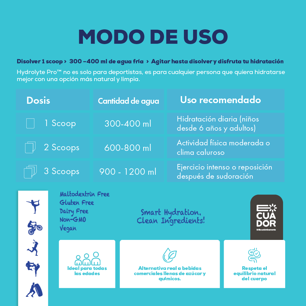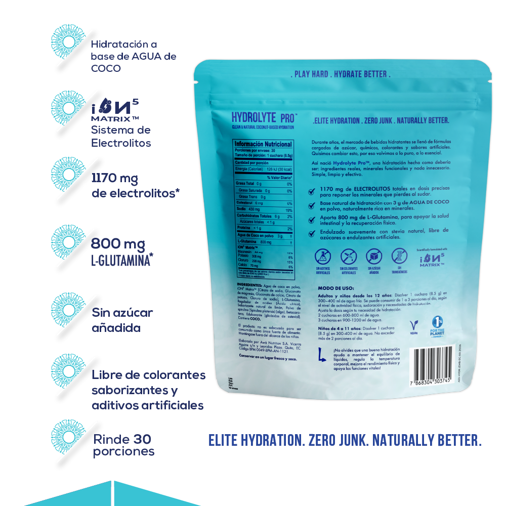 A diferencia de las otras bebidas hidratantes del mercado las cuales están llenas de azúcar, colorantes y aditivos artificiales, Hydrolyte Pro™ combina ciencia, naturaleza y funcionalidad para ofrecer una hidratación premium, segura y eficaz.